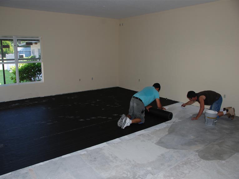 Tile underlayment is installed under all tile areas to prevent future cracks. We have never had a warranty call for cracked tiles! This floor is a remodeling project which required floating, covering an expansion joint, and new plumbing cuts in the floor. The underlayment on the right will prevent future tile cracks.