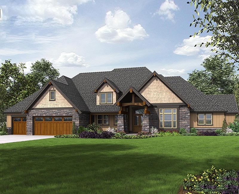 Rustic craftsman styling make this home a great choice for a wooded building site. This great room plan has a large dining area attached to the oversized kitchen. The master suite has a large walk-in closet and large showere area.
