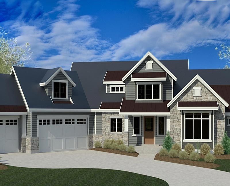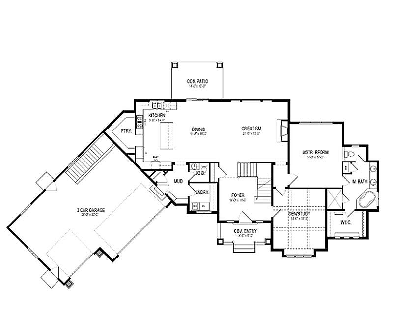 Shed dormers, peaked dormers and bay windows add character to the front elevation on this country home. The 45 degree garage adds visual interest as well as widens the home to nearly 100' making this a great home for a wide lot. The great room plan maximizes the interior spaces. The kitchen, dining and great room layout is very popular.