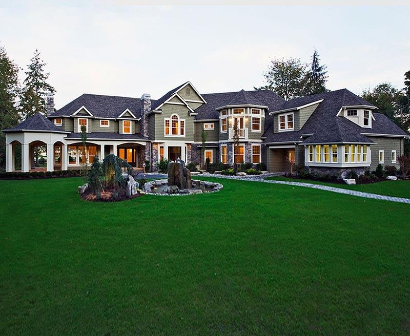 This estate home is distinguished by a graceful front porch with gazebo. The main entry leads into a double-height foyer with a balcony overlook. The extra-height formal living room and beamed dining room are located to the right, while a strong cross-axis leads through the curving stair rotunda with its formal library, to the immense 2-story family room with its rows of clerestory windows. A grand island kitchen, and BBQ/dining porch complete the main floor. The upstairs balcony hallway connects the stairwells astride the 2-story family room, accessing the grand vaulted master suite with its octagonal sitting room, spectacular master bath and huge walk-in closet. Three large secondary bedrooms with private baths, an open computer loft, and a gigantic bonus room with a fireplace complete the upper floor.