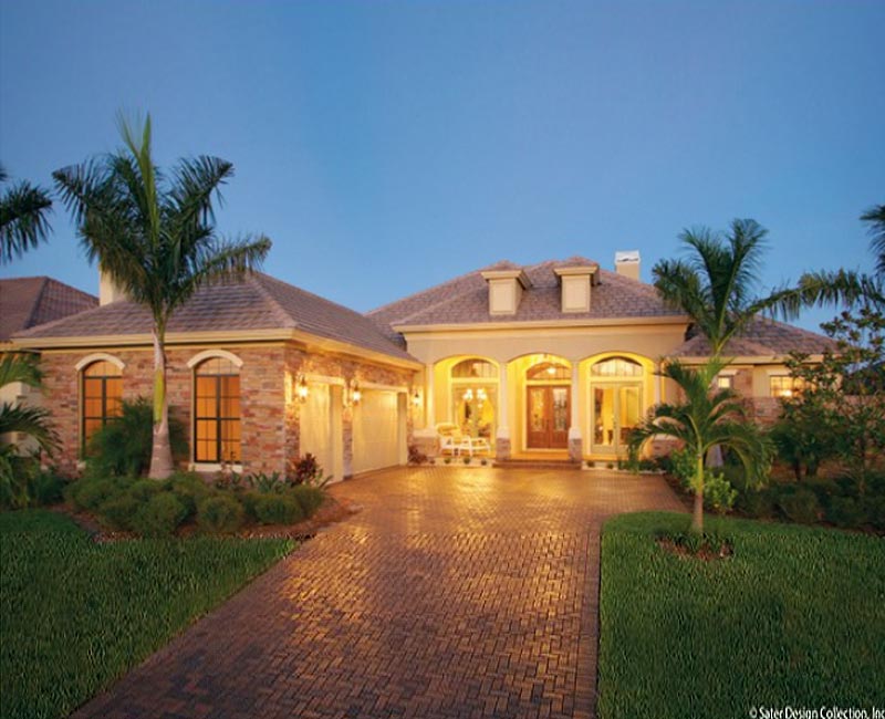 Symmetry and balance are achieved using arches and dormers on the facade of this Mediterranean charmer. The kitchen has cabinet space to spare and the oversized leisure room will allow for great entertaining. Both the study and the dining room open up to the front porch with double French doors while the living room opens to the outside with a triple pocket door. This is a very nicely laid out design with all of the features.