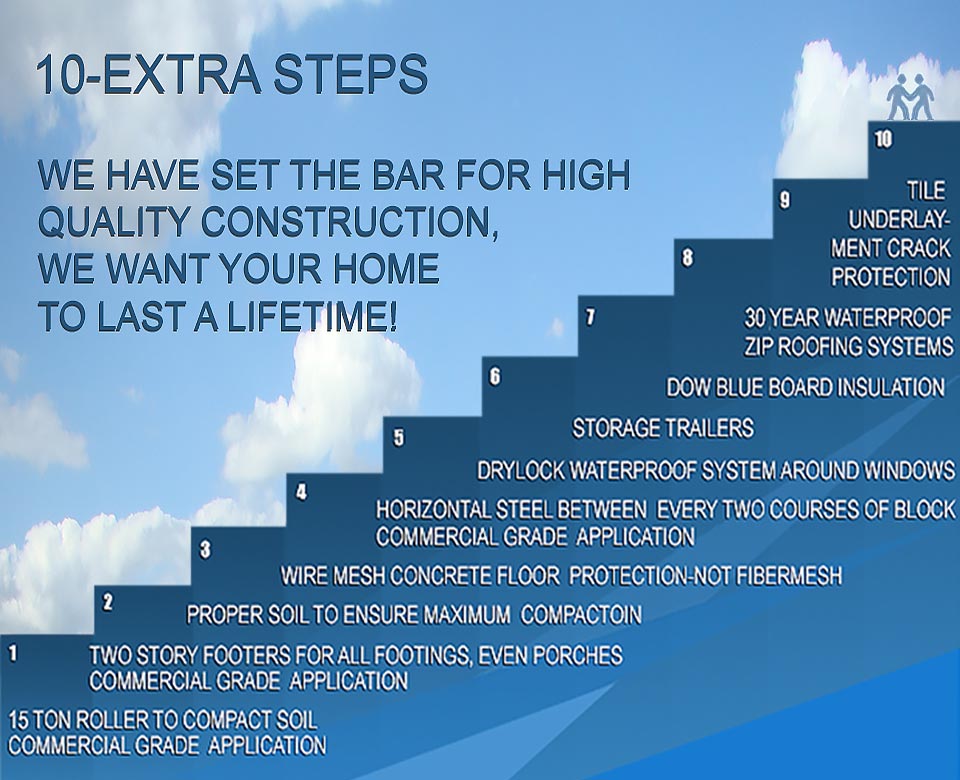 Our 10-Extra Steps truly set us apart in the industry. There is no builder that we know of that consistently uses all of these steps in building your home. Our shells are some of the strongest in the industry.